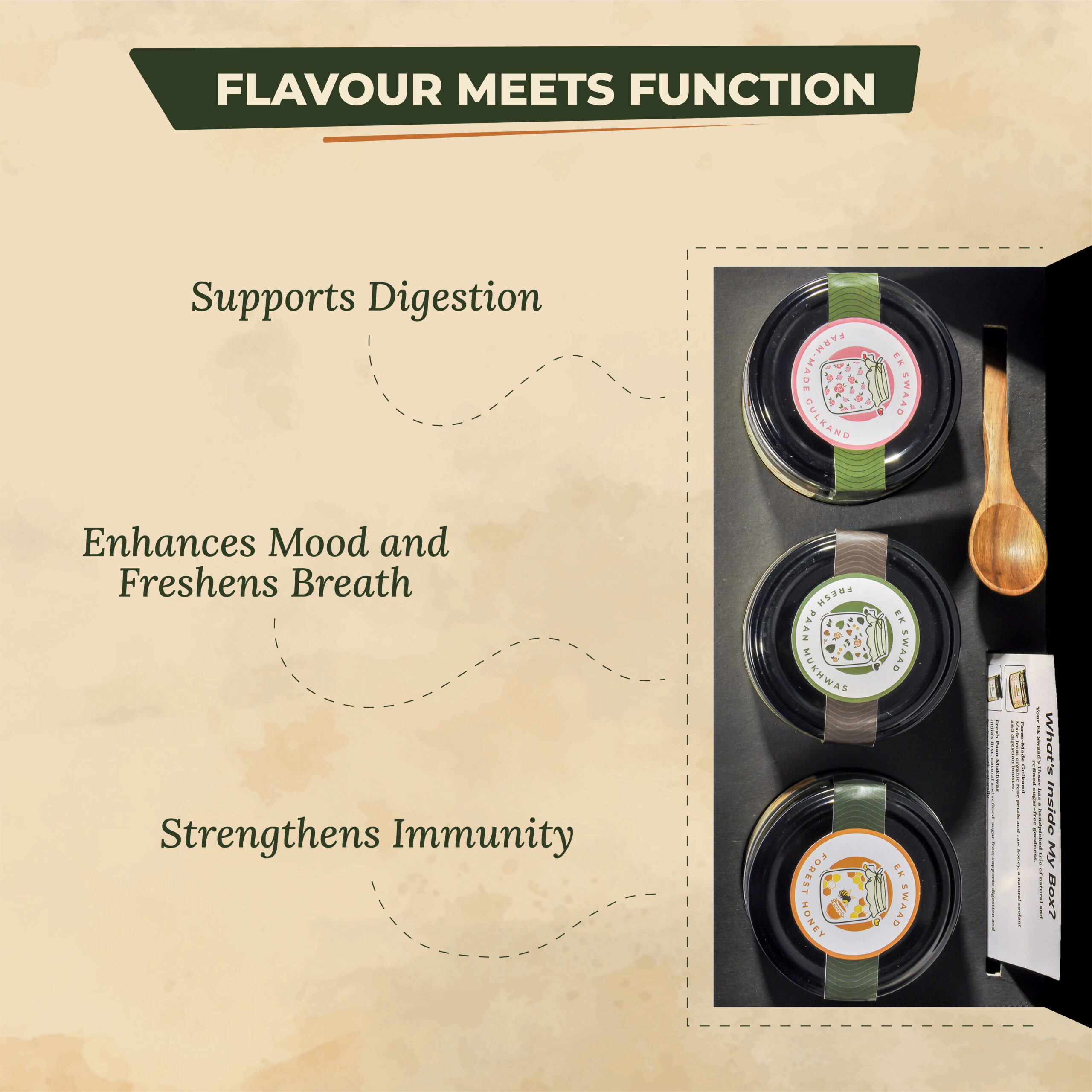 The harmony of Farm-Made Gulkand, Forest Honey and Fresh Paan Mukhwas creates a unique blend of flavour and wellness: